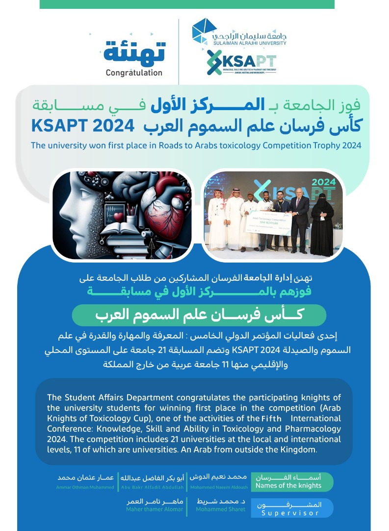 تبارك جامعة سليمان الراجحي حصول طلاب كلّيتي الطب والعلوم التطبيقية على المركز الأول للسنة الثانية على التوالي في مسابقة “كأس فرسان علماء السموم العرب” بمشاركة أكثر من ٢٠ جامعة سعودية وعربية، وذلك ضمن فعاليات “المؤتمر الدولي الخامس للمعرفة والمهارة والقدرة في الصيدلة وعلم السموم” المقام في مدينة الخبر بالمنطقة الشرقية.