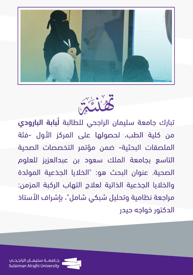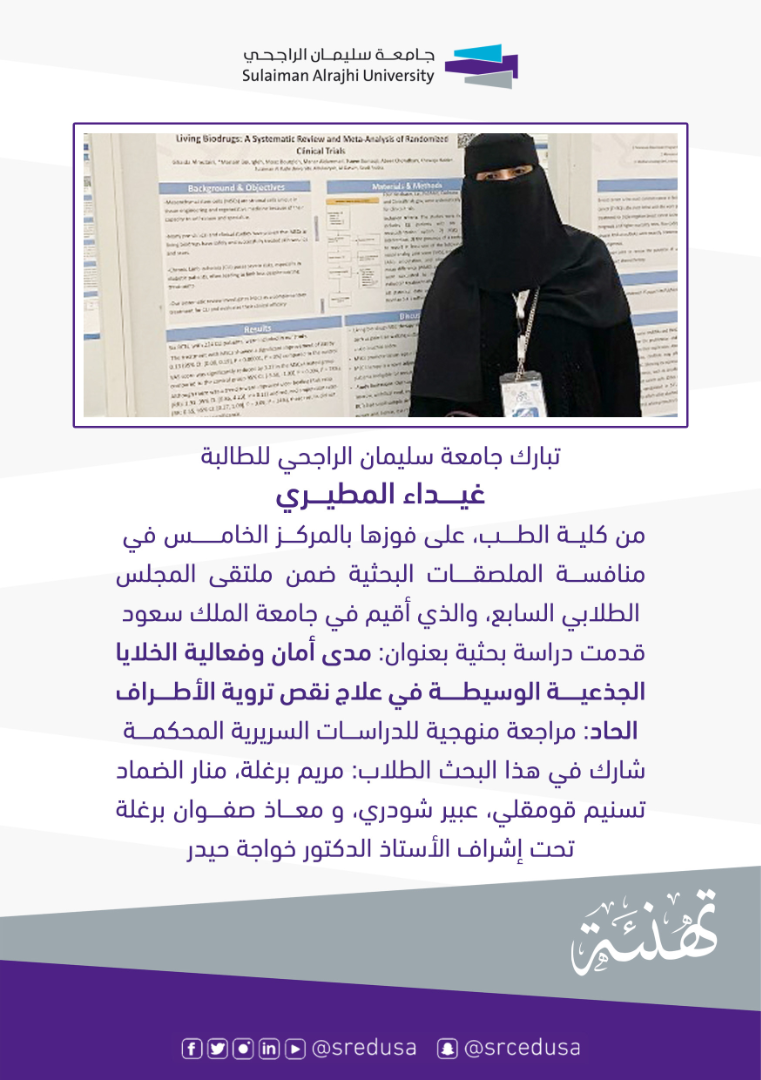 تبارك جامعة سليمان الراجحي للطالبة غيداء المطيري من كلية الطب على حصولها المركز الخامس في منافسة الملصقات البحثية ضمن ملتقى المجلس الطلابي السابع المقام في جامعة الملك سعود. وكانت الطالبة قد قدمت دراسة بحثية بعنوان: ” مدى أمان وفعالية الخلايا الجذعية الوسيطة في علاج نقص تروية الأطراف الحاد- مراجعة منهجية للدراسات السريرية المحكمة-“. شارك في هذا البحث كل من الطلاب: مريم برغلة، منار الضماد، تسنيم قومقلي، عبير شودري، ومعاذ صفوان برغلة، بإشراف الأستاذ الدكتور خواجة حيدر. فخورون بهذا الإنجاز..