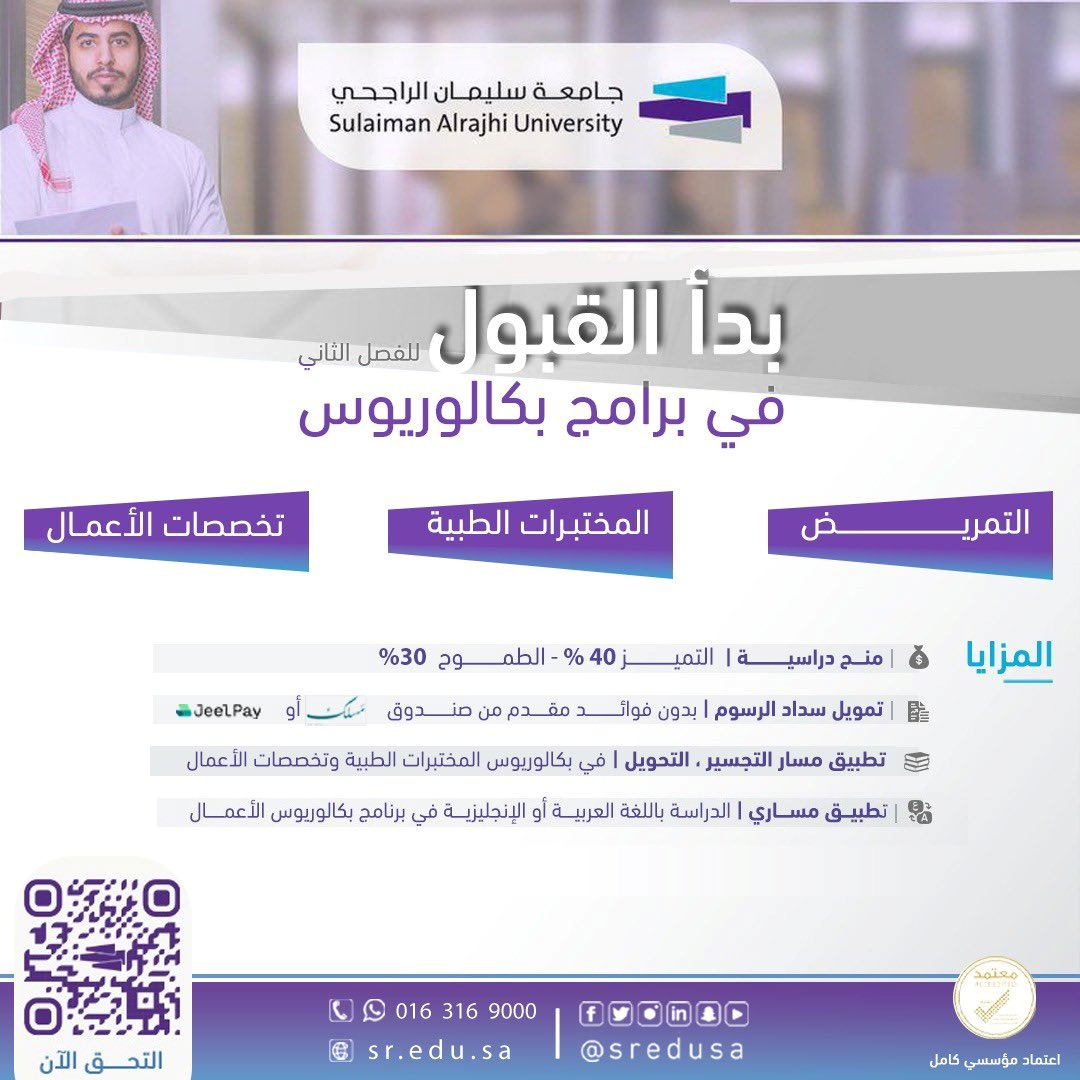 تعلن جامعة سليمان الراجحي عن بدء القبول في برامج البكالوريوس للفصل الدراسي الثاني 2025-2026 في تخصصات التمريض، المختبرات الطبية، وتخصصات الأعمال. سجّل الآن وأبدأ مسيرتك الأكاديمية.