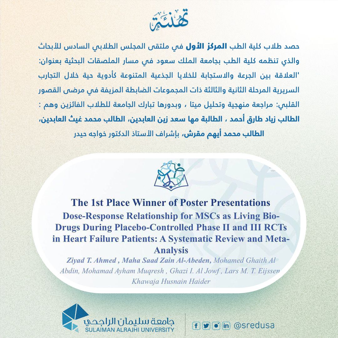 #تهنئة حصد طلاب كلية الطب المركز الأول في ملتقى المجلس الطلابي السادس للأبحاث والذي تنظمه كلية الطب بجامعة الملك سعود في مسار الملصقات البحثية بعنوان: ‘العلاقة بين الجرعة والاستجابة للخلايا الجذعية المتنوعة كأدوية حية خلال التجارب السريرية المرحلة الثانية والثالثة ذات المجموعات الضابطة المزيفة في مرضى القصور القلبي: مراجعة منهجية وتحليل ميتا.’. وتهنيء الجامعة الطلاب الفائزين وهم : الطالب زياد طارق أحمد ، الطالبة مها سعد زين العابدين، الطالب محمد غيث العابدين، الطالب محمد أيهم مقرش، بإشراف البرفيسور خواجه حيدر. فخورون بهذا الإنجاز #جامعة_سليمان_الراجحي