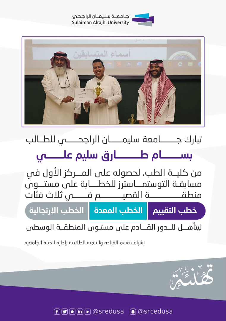 تبارك جامعة سليمان الراجحي الطالب بسام طارق سليم علي من كلية الطب، لحصوله على المركز الأول في مسابقة التوستماسترز في ثلاث فئات: خطب التقييم، الخطب المعدة، والخطب الارتجالية. تُعد مسابقة التوستماسترز من الفعاليات المميزة التي تهدف إلى تعزيز مهارات الخطابة والقيادة لدى الطلاب، حيث يتنافس المشاركون في تقديم خطبهم بأسلوب مؤثر ومهني. فخورون بهذا الإنجاز..