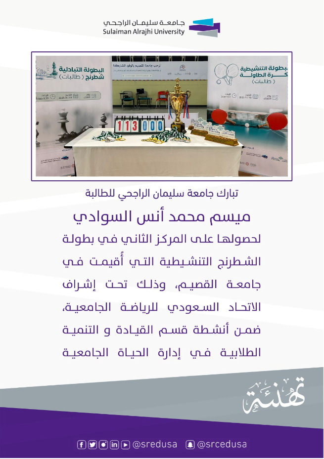 تهنئة للطالبة ميسم السوادي لحصولها على المركز الثاني في بطولة الشطرنج التنشيطية بجامعة القصيم