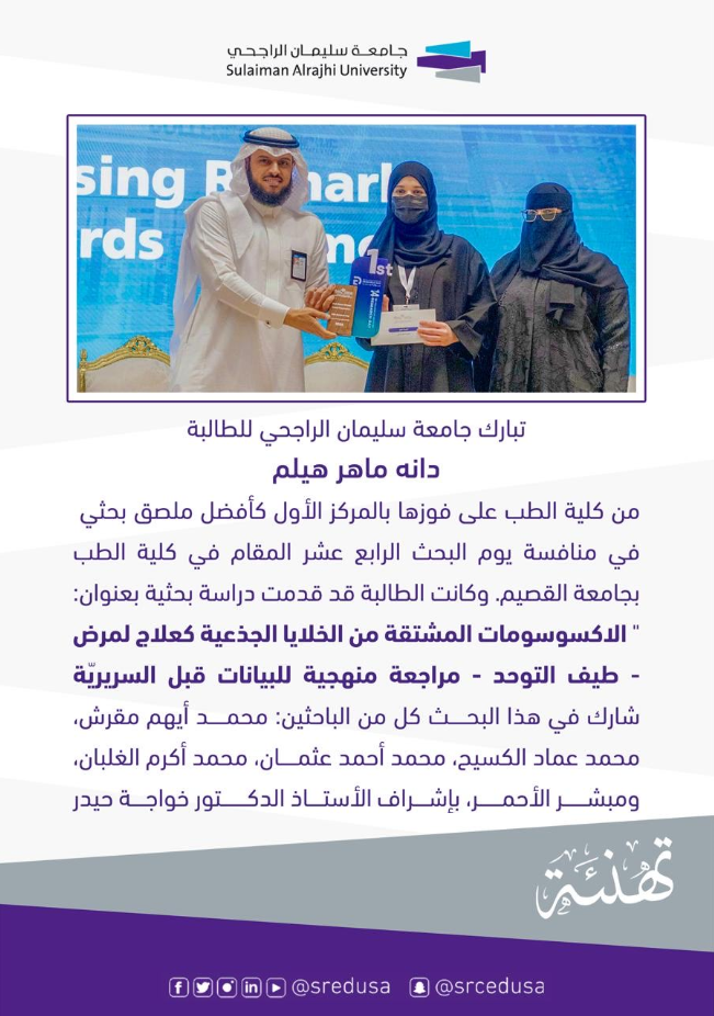 تهنئة | تبارك جامعة سليمان الراجحي للطالبة دانه ماهر هيلم من كلية الطب على فوزها بالمركز الأول كأفضل ملصق بحثي في منافسة يوم البحث الرابع عشر المقام في كلية الطب بجامعة القصيم. وكانت الطالبة قد قدمت دراسة بحثية بعنوان: ” الاكسوسومات المشتقة من الخلايا الجذعية كعلاج لمرض طيف التوحد – مراجعة منهجية للبيانات قبل السريريّة -“. شارك في هذا البحث كل من الباحثين: محمد أيهم مقرش، محمد عماد الكسيح، محمد أحمد عثمان، محمد أكرم الغلبان، ومبشر الأحمر، بإشراف الأستاذ الدكتور خواجة حيدر. فخورون بهذا الإنجاز.