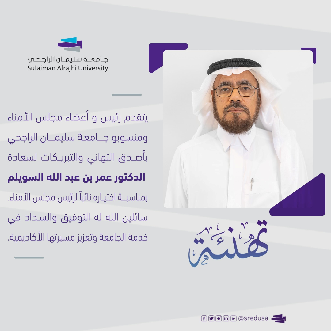 يتقدم رئيس وأعضاء مجلس الأمناء ومنسوبو جامعة سليمان الراجحي بأصدق التهاني والتبريكات لسعادة الدكتور عمر بن عبد الله السويلم بمناسبة اختياره نائبًا لرئيس مجلس الأمناء.