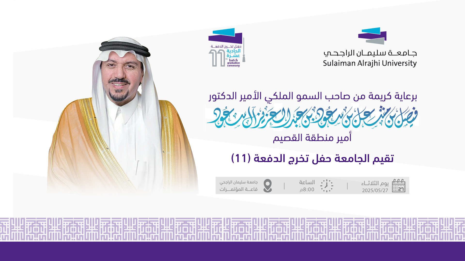 يرعى صاحب السمو الملكي الأمير الدكتور فيصل بن مشعل بن سعود بن عبدالعزيز، أمير منطقة القصيم، مساء الثلاثاء 27 مايو 2025م، حفل تخريج الدفعة الحادية عشرة من طلاب وطالبات جامعة سليمان الراجحي، وذلك في قاعة المؤتمرات الجديدة بالمدينة الجامعية بمحافظة البكيرية. ويأتي هذا الحفل السنوي امتدادًا للدعم المتواصل الذي توليه القيادة الرشيدة لمسيرة التعليم، ولتحفيز التميز الأكاديمي في مؤسسات التعليم العالي بالمملكة. ويُتوج الحفل بتخريج 176 طالبًا وطالبة، يمثلون ثمرة الجهود الأكاديمية والمهنية للجامعة، حيث نال 66 طالبًا و10 طالبات درجة الماجستير التنفيذي في إدارة الأعمال، في حين حصل 47 طالبًا و53 طالبة على درجة البكالوريوس في تخصصات متنوعة موزعة على أربع كليات. من جهته، عبّر رئيس الجامعة الدكتور محمد بن عبدالله المحيميد عن بالغ شكره واعتزازه برعاية سمو أمير المنطقة لهذا الحدث التعليمي المهم، مشيرًا إلى أن رعاية سموه تمثل حافزًا كبيرًا للطلبة، وتجسيدًا حيًا لاهتمام القيادة بإعداد جيلٍ طموحٍ، متسلّحٍ بالعلم، ومؤهلٍ لمواكبة المتغيرات المتسارعة في سوق العمل. واختتم المحيميد حديثه بتقديم التهنئة للخريجين والخريجات وأسرهم، متمنيًا لهم مستقبلًا زاهرًا، ومؤكدًا على استمرار الجامعة في أداء رسالتها التعليمية والوطنية بروح من التميز والإبداع.