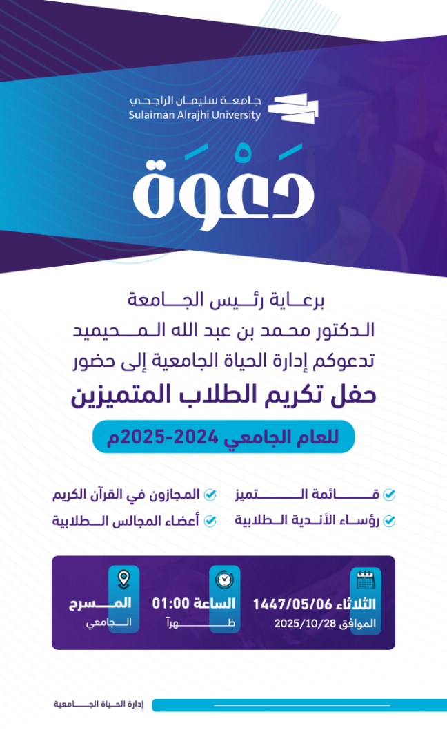 تتشرف إدارة الحياة الجامعية بدعوتكم لحضور حفل تكريم الطلاب المتميزين للعام الأكاديمي 2024-2025م، ويشمل التكريم الفئات التالية: – قائمة التميز – المجازون في القرآن الكريم – رؤساء الأندية الطلابية – أعضاء المجالس الطلابية وذلك يوم الثلاثاء، 6 جمادى الأولى 1447هـ، الموافق 28 أكتوبر 2025م في تمام الساعة الواحدة ظهرًا بالمسرح الجامعي نتطلع لحضوركم ومشاركتكم الفعالة.