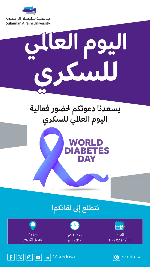 يسرنا دعوتكم لحضور معرض اليوم العالمي للسكري، وذلك بالتزامن مع أنشطة وفعاليات الجامعة في الاحتفاء بالأيام العالمية المرتبطة بالتوعية الصحية. التاريخ: الأحد 16 نوفمبر 2025م الوقت: من الساعة 11:00 صباحًا حتى 12:30 ظهرًا المكان: مبنى (3) نتطلع إلى حضوركم ومشاركتكم الفاعلة.