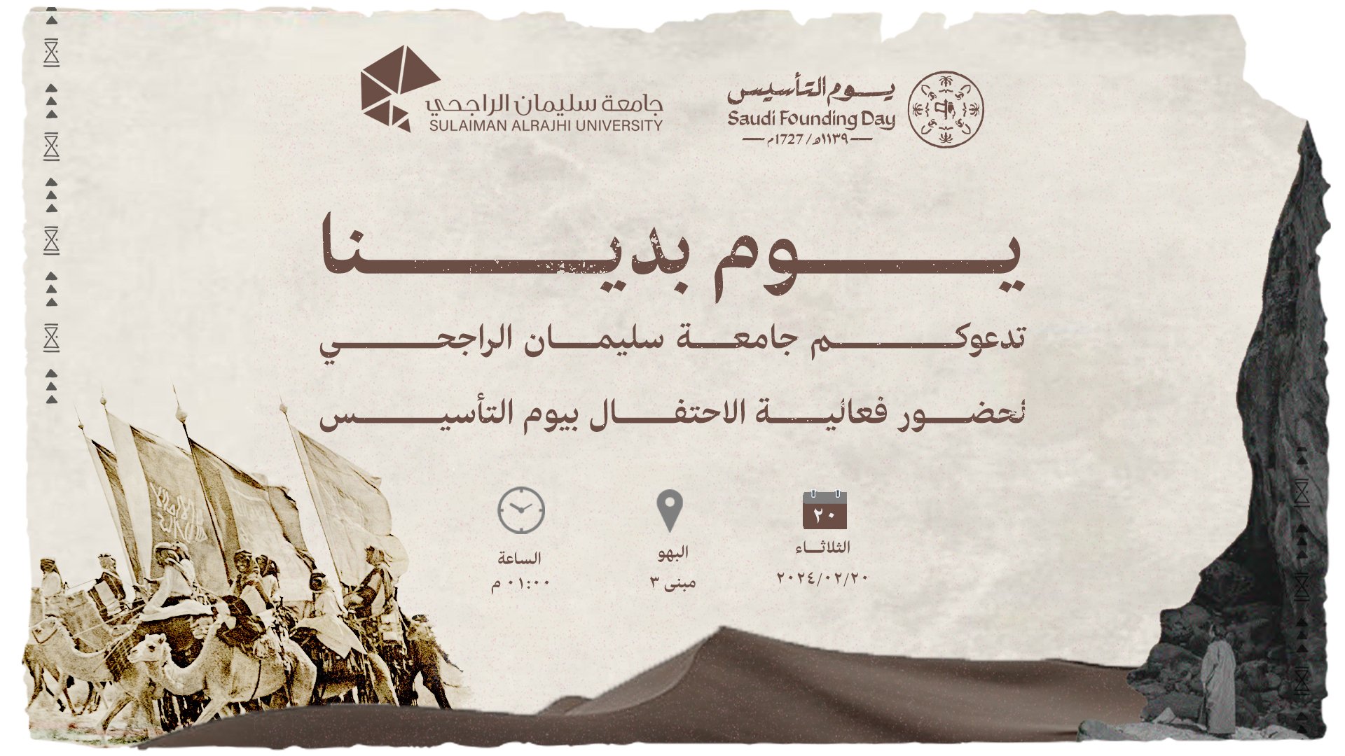 تحتفل جامعة سليمان الراجحي بيوم التأسيس السعودي في يوم الثلاثاء 20-2-2024م في بهو الجامعة برعاية من رئيس الجامعة الدكتور محمد المحيميد.