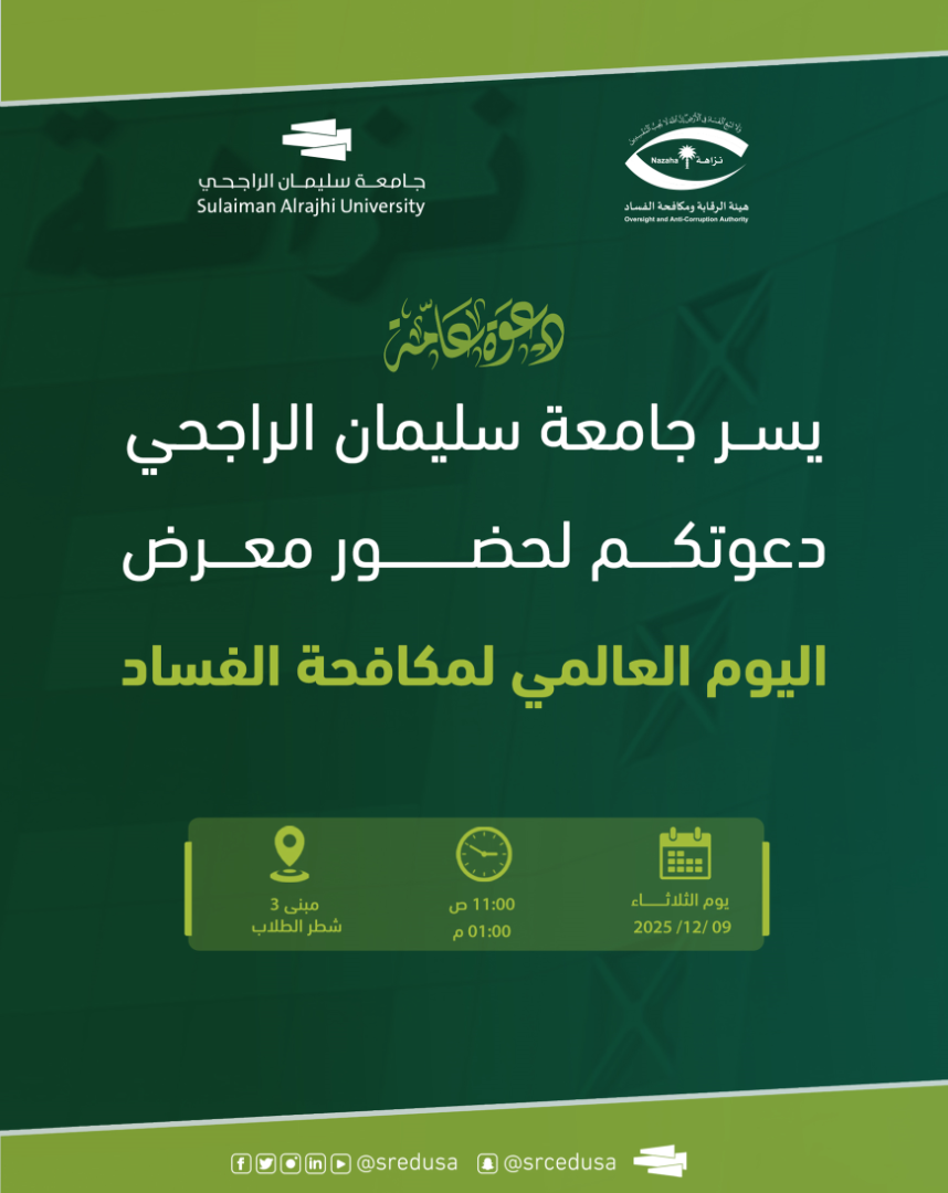 تنظم الجامعة ممثلة بنادي نزاهة الاجتماعي معرضًا توعويًا بمناسبة اليوم العالمي لمكافحة الفساد، وذلك صباح يوم الثلاثاء 09 ديسمبر 2025م من الساعة 11:00 صباحًا حتى 01:00 ظهرًا، في مبنى رقم 3 – شطر الطلاب وللطالبات في البهو الرئيس. تهدف الفعالية إلى تعزيز الوعي بقيم النزاهة والشفافية، وتسليط الضوء على الجهود الوطنية والدولية في مكافحة الفساد، إضافة إلى إبراز دور الجامعة في نشر ثقافة السلوك المهني المسؤول. نتطلع إلى مشاركتكم في هذه الفعالية التي تعكس التزام الجامعة برسالتها في بناء بيئة تعليمية قائمة على القيم والأخلاق.