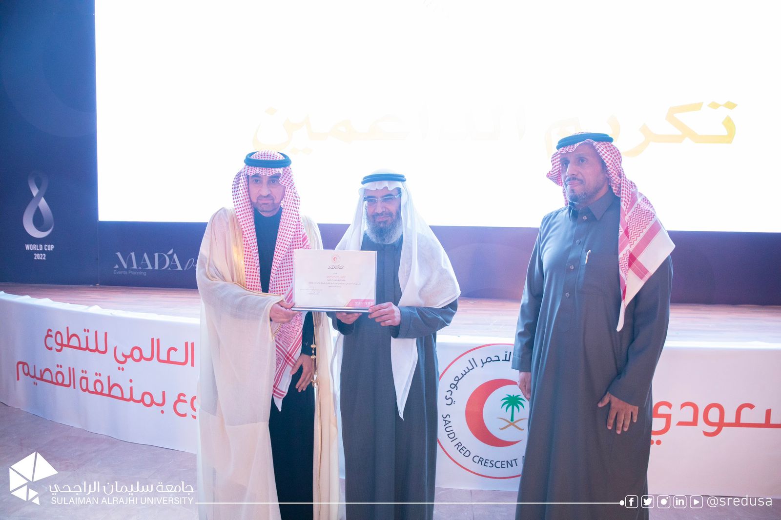 الهلال الأحمر يكرّم جامعة سليمان الراجحي كرّمت هيئة الهلال الأحمر جامعةَ سليمان الراجحي لدعمها الأنشطة التطوعية للهيئة، واستلم التكريم رئيس الجامعة المكلف أ.د. عبدالرحمن بن محمد المزروع، بحضور وكيل المحافظة لمحافظة البكيرية الأستاذ علي بن عبدالله السويلم. وذلك في حفل إقامته هيئة الهلال الأحمر بفرع القصيم لتكريم الجهات والأفراد الذين تميزوا في دعم الأنشطة التطوعية للهيئة في منطقة القصيم، وأقيم الحفل في مركز الملك عبدالله للاحتفالات في البكيرية . كما كرّم عدد من طلاب وطالبات الجامعة الذين تجاوزت ساعاتهم 100 ساعة تطوعية خلال العام 2022م. الجدير بالذكر أن من متطلبات تخرج الطلاب من الجامعة تقديم ساعات خدمة مجتمعية بحد أدنى ٣٠ ساعة كشرط للتخرج.